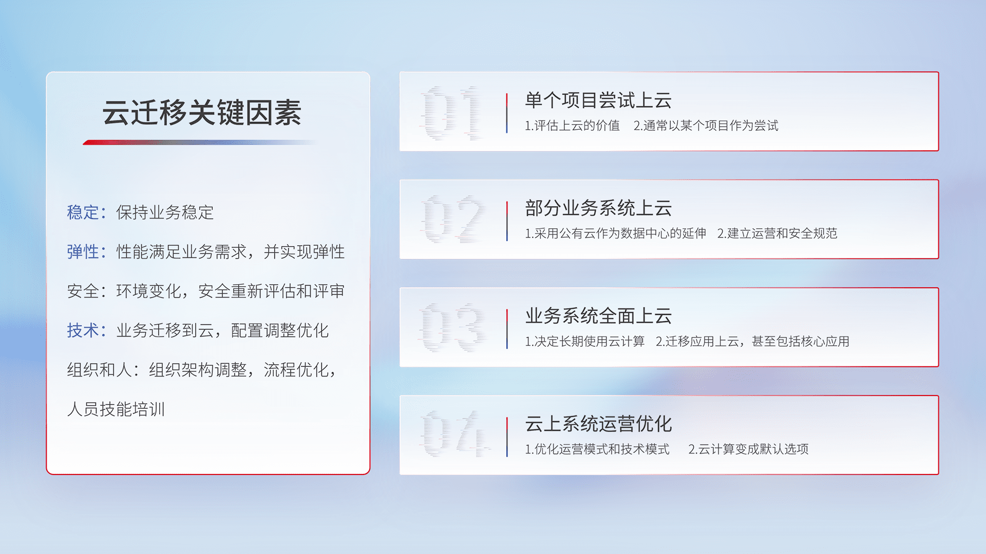 结合实际业务,,,,从规划设计、、、、云平台选型、、、云原生改造、、、、数据迁移、、、集成交付,,迁移全过程为客户识别最佳上云路径,,,做好风险识别管理,,设计网络架构、、、身份权限、、、安全审计合规、、、、操作审计、、、日志审计、、监控告警策略、、、多站点容灾设计等,,对云上基础设施进行整体规划,,,提升IT治理水平,,以满足弹性、、、、高可用、、、、高性能的需求。。。